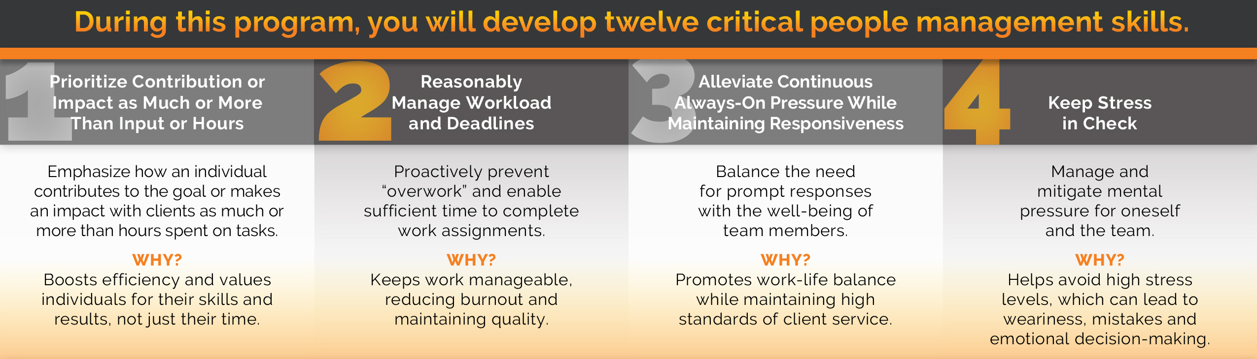 Three cohorts will be specifically tailored for law firm lawyers who have been partners for five years or less. These cohorts provide a unique opportunity to discuss the learned concepts in depth, engage in peer discussion and apply best practices in real life.